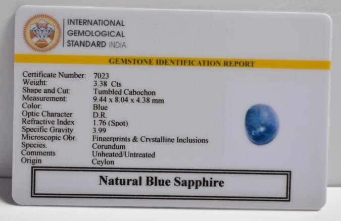 Certified Natural Blue Sapphire 3.38 Ct.(3+ Ratti) in Tumbled Cabochon shape
