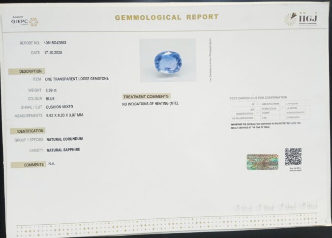 Beautiful 3.39 Cts NATURAL SAPPHIRE (Top++-Mines) sva 3+ Ratti BLUE SAPPHIRE. Free Horoscope & Free Pundit Ji Astrological Advise / Consultation. Original Natural Lab certified gems by IGI GTL / Birth stones / Large Gem Selection of shree shubh Rashi Ratan Vedic dhan at Gem Mines. May Bhagwan Brahma, Vishnu, Shiv & Universe bless you.