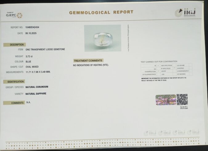Beautiful 3.72 Cts NATURAL SAPPHIRE (Good-Mines) sva 4+ Ratti BLUE SAPPHIRE. Free Horoscope & Free Pundit Ji Astrological Advise / Consultation. Original Natural Lab certified gems by IGI GTL / Birth stones / Large Gem Selection of shree shubh Rashi Ratan Vedic dhan at Gem Mines. May Bhagwan Brahma, Vishnu, Shiv & Universe bless you.