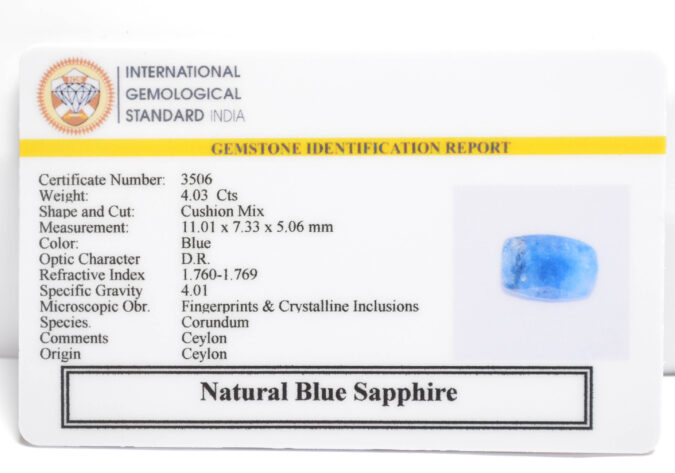 Beautiful 4.03 Cts Natural Blue Sapphire (Very Good-Mines) sva 4+ Ratti BLUE SAPPHIRE. Free Horoscope & Free Pundit Ji Astrological Advise / Consultation. Original Natural Lab certified gems by IGI GTL / Birth stones / Large Gem Selection of shree shubh Rashi Ratan Vedic dhan at Gem Mines. May Bhagwan Brahma, Vishnu, Shiv & Universe bless you.