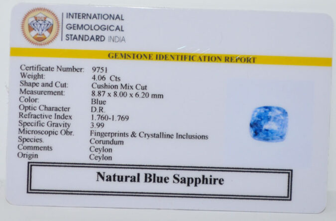 Beautiful 4.06 Cts Natural Blue Sapphire (AAA+-Mines) sva 4+ Ratti BLUE SAPPHIRE. Free Horoscope & Free Pundit Ji Astrological Advise / Consultation. Original Natural Lab certified gems by IGI GTL / Birth stones / Large Gem Selection of shree shubh Rashi Ratan Vedic dhan at Gem Mines. May Bhagwan Brahma, Vishnu, Shiv & Universe bless you.