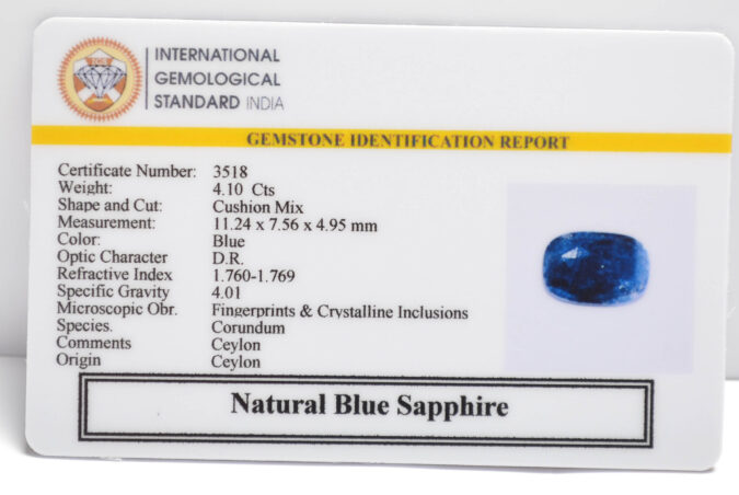 Beautiful 4.1 Cts Natural Blue Sapphire (Very Good-Mines) sva 4+ Ratti BLUE SAPPHIRE. Free Horoscope & Free Pundit Ji Astrological Advise / Consultation. Original Natural Lab certified gems by IGI GTL / Birth stones / Large Gem Selection of shree shubh Rashi Ratan Vedic dhan at Gem Mines. May Bhagwan Brahma, Vishnu, Shiv & Universe bless you.