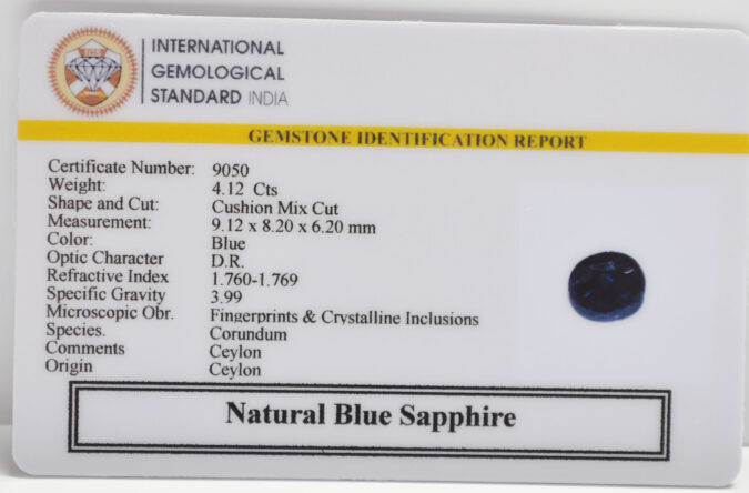 Beautiful 4.12 Cts Natural Blue Sapphire (Good-Mines) sva 4+ Ratti BLUE SAPPHIRE. Free Horoscope & Free Pundit Ji Astrological Advise / Consultation. Original Natural Lab certified gems by IGI GTL / Birth stones / Large Gem Selection of shree shubh Rashi Ratan Vedic dhan at Gem Mines. May Bhagwan Brahma, Vishnu, Shiv & Universe bless you.