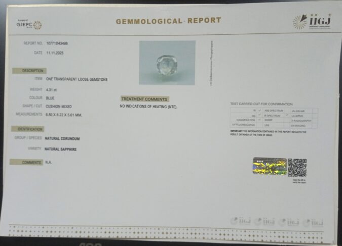 Certified NATURAL SAPPHIRE 4.31 Ct.(4+ Ratti) in Cushion Mixed shape