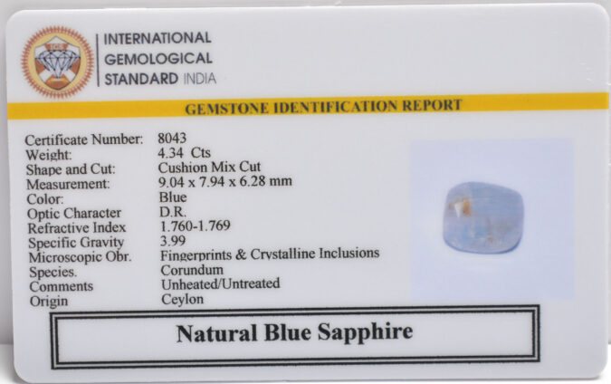Certified Natural Blue Sapphire 4.34 Ct.(4+ Ratti) in Cushion Mix Cut shape