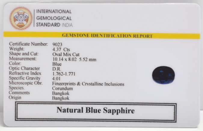 Beautiful 4.37 Cts Natural Blue Sapphire (Good-Mines) sva 4+ Ratti BLUE SAPPHIRE. Free Horoscope & Free Pundit Ji Astrological Advise / Consultation. Original Natural Lab certified gems by IGI GTL / Birth stones / Large Gem Selection of shree shubh Rashi Ratan Vedic dhan at Gem Mines. May Bhagwan Brahma, Vishnu, Shiv & Universe bless you.