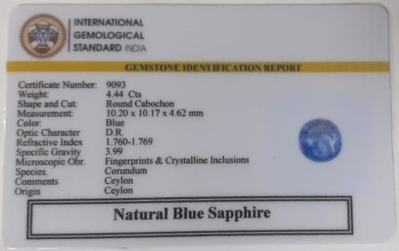 Beautiful 4.44 Cts Natural Blue Sapphire (AAA+-Mines) sva 4+ Ratti BLUE SAPPHIRE. Free Horoscope & Free Pundit Ji Astrological Advise / Consultation. Original Natural Lab certified gems by IGI GTL / Birth stones / Large Gem Selection of shree shubh Rashi Ratan Vedic dhan at Gem Mines. May Bhagwan Brahma, Vishnu, Shiv & Universe bless you.