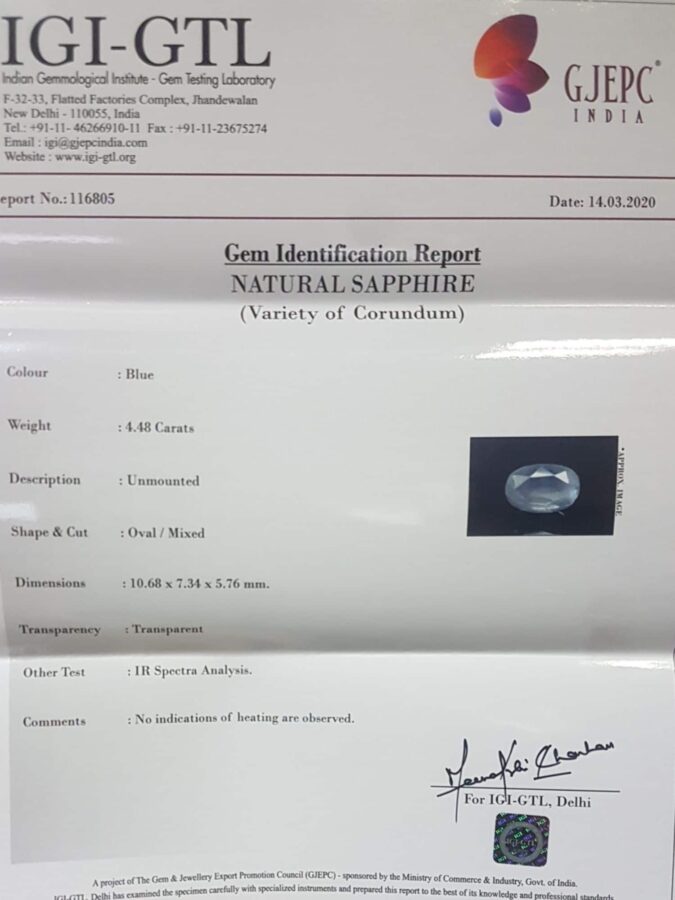 Beautiful 4.48 Ct. Blue Sapphire (Ceylon Sri Lanka) Sava 4 Ratti Neelam. Free Horoscope & Free Pundit Ji Advise / Consultation. Original Natural Lab certified gems by IGI GTL / Birth stones / Large Gem Selection of shree shubh Rashi Ratan Vedic dhan at Gem Mines. May Bhagwan Brahma, Vishnu, Shiv & Universe bless you.