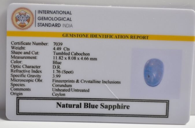 Beautiful 4.49 Cts Natural Blue Sapphire (Very Good-Mines) sva 4+ Ratti BLUE SAPPHIRE. Free Horoscope & Free Pundit Ji Astrological Advise / Consultation. Original Natural Lab certified gems by IGI GTL / Birth stones / Large Gem Selection of shree shubh Rashi Ratan Vedic dhan at Gem Mines. May Bhagwan Brahma, Vishnu, Shiv & Universe bless you.