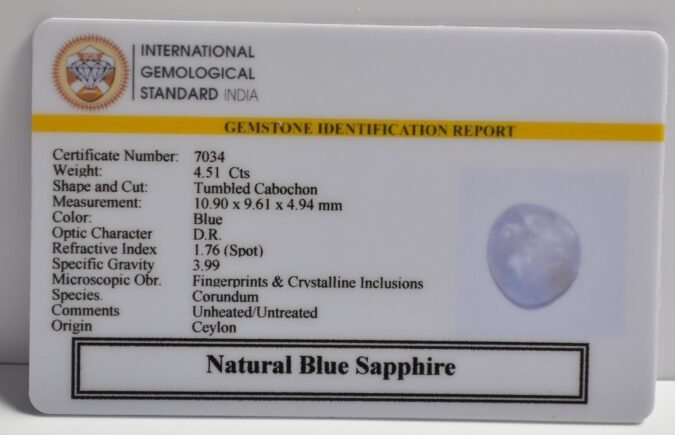 Beautiful 4.51 Cts Natural Blue Sapphire (Very Good-Mines) sva 5+ Ratti BLUE SAPPHIRE. Free Horoscope & Free Pundit Ji Astrological Advise / Consultation. Original Natural Lab certified gems by IGI GTL / Birth stones / Large Gem Selection of shree shubh Rashi Ratan Vedic dhan at Gem Mines. May Bhagwan Brahma, Vishnu, Shiv & Universe bless you.