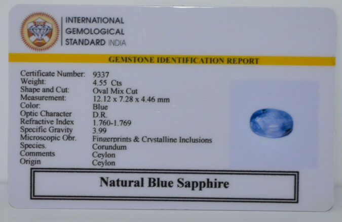 Beautiful 4.55 Cts Natural Blue Sapphire (AAA-Mines) sva 5+ Ratti BLUE SAPPHIRE. Free Horoscope & Free Pundit Ji Astrological Advise / Consultation. Original Natural Lab certified gems by IGI GTL / Birth stones / Large Gem Selection of shree shubh Rashi Ratan Vedic dhan at Gem Mines. May Bhagwan Brahma, Vishnu, Shiv & Universe bless you.