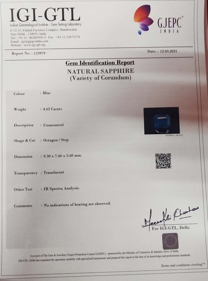 Beautiful 4.62 Ct. Blue Sapphire (Ceylon (Sri Lanka) Mines) Sava 5 Ratti Neelam. Free Horoscope & Free Pundit Ji Advise / Consultation. Original Natural Lab certified gems by IGI GTL / Birth stones / Large Gem Selection of shree shubh Rashi Ratan Vedic dhan at Gem Mines. May Bhagwan Brahma, Vishnu, Shiv & Universe bless you.