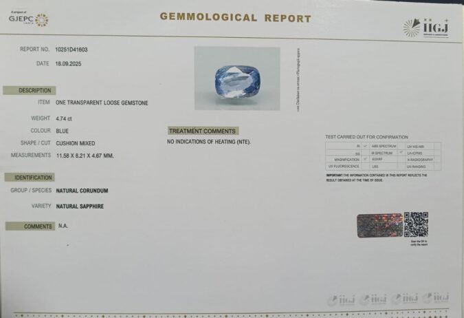 Beautiful 4.74 Cts Natural Blue Sapphire (Top++-Mines) sva 5+ Ratti BLUE SAPPHIRE. Free Horoscope & Free Pundit Ji Astrological Advise / Consultation. Original Natural Lab certified gems by IGI GTL / Birth stones / Large Gem Selection of shree shubh Rashi Ratan Vedic dhan at Gem Mines. May Bhagwan Brahma, Vishnu, Shiv & Universe bless you.