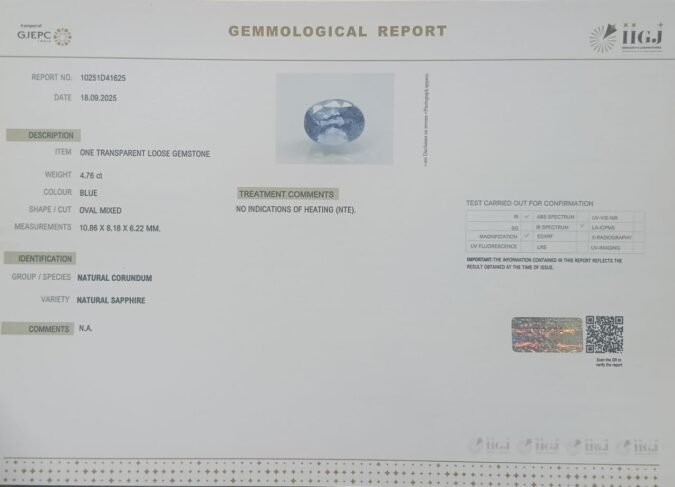 Beautiful 4.76 Cts Natural Blue Sapphire (Top-Mines) sva 5+ Ratti BLUE SAPPHIRE. Free Horoscope & Free Pundit Ji Astrological Advise / Consultation. Original Natural Lab certified gems by IGI GTL / Birth stones / Large Gem Selection of shree shubh Rashi Ratan Vedic dhan at Gem Mines. May Bhagwan Brahma, Vishnu, Shiv & Universe bless you.