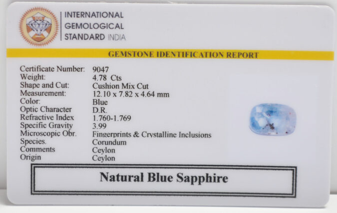 Beautiful 4.78 Cts Natural Blue Sapphire (Good-Mines) sva 5+ Ratti BLUE SAPPHIRE. Free Horoscope & Free Pundit Ji Astrological Advise / Consultation. Original Natural Lab certified gems by IGI GTL / Birth stones / Large Gem Selection of shree shubh Rashi Ratan Vedic dhan at Gem Mines. May Bhagwan Brahma, Vishnu, Shiv & Universe bless you.