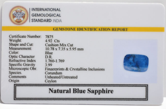 Beautiful 4.92 Cts Natural Blue Sapphire (Very Good-Mines) sva 5+ Ratti BLUE SAPPHIRE. Free Horoscope & Free Pundit Ji Astrological Advise / Consultation. Original Natural Lab certified gems by IGI GTL / Birth stones / Large Gem Selection of shree shubh Rashi Ratan Vedic dhan at Gem Mines. May Bhagwan Brahma, Vishnu, Shiv & Universe bless you.