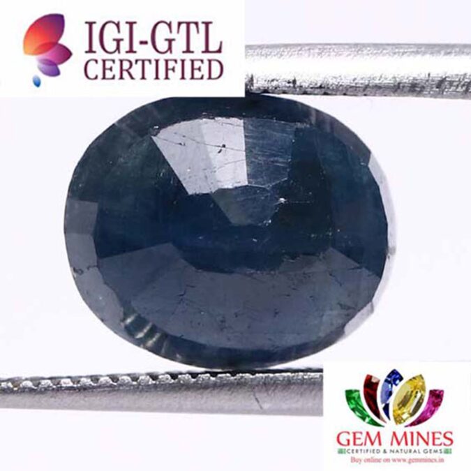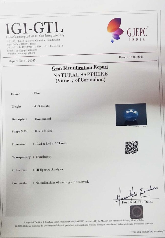 Beautiful 4.99 Ct. Blue Sapphire (Ceylon (Sri Lanka) Mines) Sava 5 Ratti Neelam. Free Horoscope & Free Pundit Ji Advise / Consultation. Original Natural Lab certified gems by IGI GTL / Birth stones / Large Gem Selection of shree shubh Rashi Ratan Vedic dhan at Gem Mines. May Bhagwan Brahma, Vishnu, Shiv & Universe bless you.