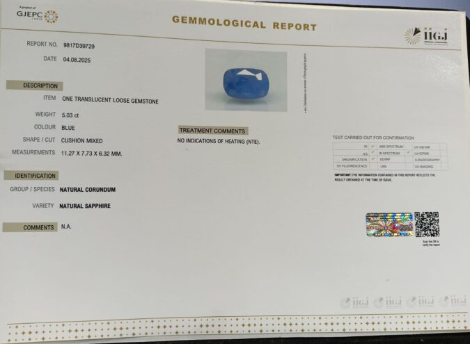 Beautiful 5.03 Cts Natural Blue Sapphire (AAA+-Mines) sva 5+ Ratti BLUE SAPPHIRE. Free Horoscope & Free Pundit Ji Astrological Advise / Consultation. Original Natural Lab certified gems by IGI GTL / Birth stones / Large Gem Selection of shree shubh Rashi Ratan Vedic dhan at Gem Mines. May Bhagwan Brahma, Vishnu, Shiv & Universe bless you.