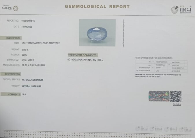 Beautiful 5.05 Cts Natural Blue Sapphire (Top-Mines) sva 5+ Ratti BLUE SAPPHIRE. Free Horoscope & Free Pundit Ji Astrological Advise / Consultation. Original Natural Lab certified gems by IGI GTL / Birth stones / Large Gem Selection of shree shubh Rashi Ratan Vedic dhan at Gem Mines. May Bhagwan Brahma, Vishnu, Shiv & Universe bless you.