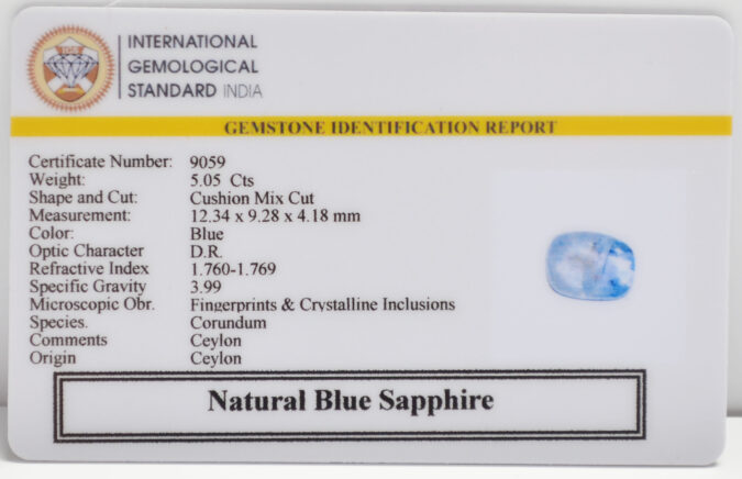 Beautiful 5.05 Cts Natural Blue Sapphire (Good-Mines) sva 5+ Ratti BLUE SAPPHIRE. Free Horoscope & Free Pundit Ji Astrological Advise / Consultation. Original Natural Lab certified gems by IGI GTL / Birth stones / Large Gem Selection of shree shubh Rashi Ratan Vedic dhan at Gem Mines. May Bhagwan Brahma, Vishnu, Shiv & Universe bless you.