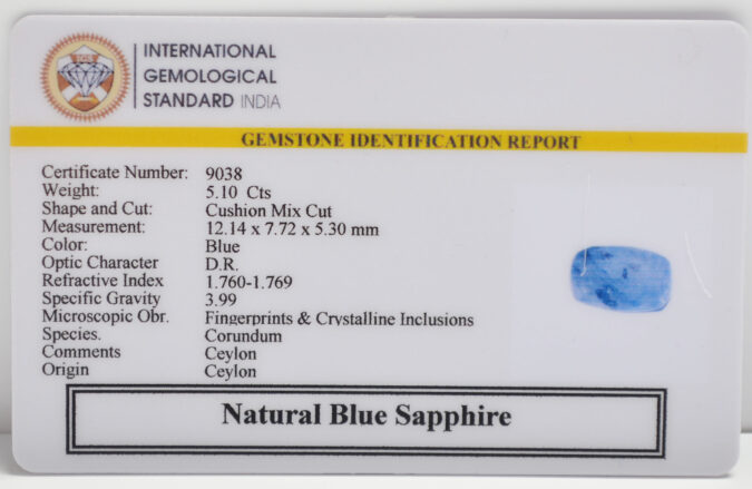 Beautiful 5.1 Cts Natural Blue Sapphire (Good-Mines) sva 5+ Ratti BLUE SAPPHIRE. Free Horoscope & Free Pundit Ji Astrological Advise / Consultation. Original Natural Lab certified gems by IGI GTL / Birth stones / Large Gem Selection of shree shubh Rashi Ratan Vedic dhan at Gem Mines. May Bhagwan Brahma, Vishnu, Shiv & Universe bless you.