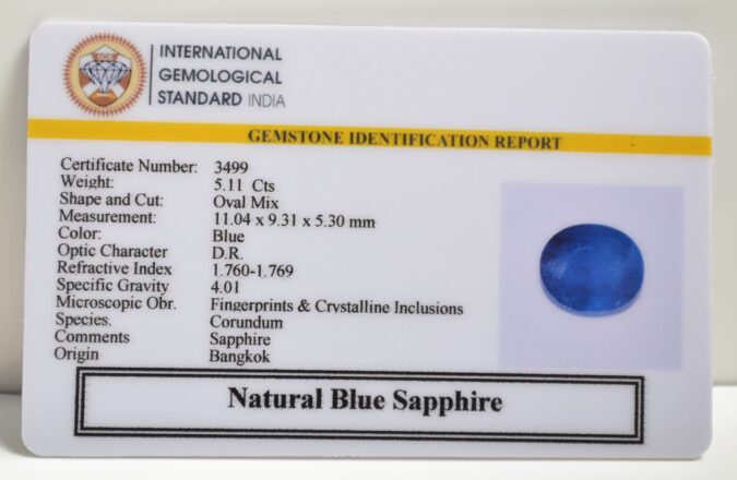 Beautiful 5.11 Cts Natural Blue Sapphire (Good-Mines) sva 5+ Ratti BLUE SAPPHIRE. Free Horoscope & Free Pundit Ji Astrological Advise / Consultation. Original Natural Lab certified gems by IGI GTL / Birth stones / Large Gem Selection of shree shubh Rashi Ratan Vedic dhan at Gem Mines. May Bhagwan Brahma, Vishnu, Shiv & Universe bless you.