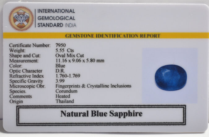 Beautiful 5.55 Cts Natural Blue Sapphire (Good-Mines) sva 6+ Ratti BLUE SAPPHIRE. Free Horoscope & Free Pundit Ji Astrological Advise / Consultation. Original Natural Lab certified gems by IGI GTL / Birth stones / Large Gem Selection of shree shubh Rashi Ratan Vedic dhan at Gem Mines. May Bhagwan Brahma, Vishnu, Shiv & Universe bless you.
