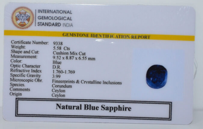 Beautiful 5.58 Cts Natural Blue Sapphire (AAA+-Mines) sva 6+ Ratti BLUE SAPPHIRE. Free Horoscope & Free Pundit Ji Astrological Advise / Consultation. Original Natural Lab certified gems by IGI GTL / Birth stones / Large Gem Selection of shree shubh Rashi Ratan Vedic dhan at Gem Mines. May Bhagwan Brahma, Vishnu, Shiv & Universe bless you.