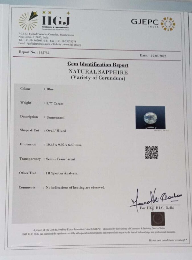 Beautiful 5.77 Ct. Blue Sapphire (Ceylon (Sri Lanka) Mines) Sava 6 Ratti Neelam. Free Horoscope & Free Pundit Ji Advise / Consultation. Original Natural Lab certified gems by IGI GTL / Birth stones / Large Gem Selection of shree shubh Rashi Ratan Vedic dhan at Gem Mines. May Bhagwan Brahma, Vishnu, Shiv & Universe bless you.