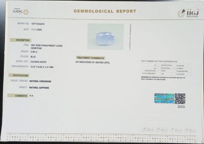 Beautiful 5.86 Cts NATURAL SAPPHIRE (AAA+-Mines) sva 6+ Ratti BLUE SAPPHIRE. Free Horoscope & Free Pundit Ji Astrological Advise / Consultation. Original Natural Lab certified gems by IGI GTL / Birth stones / Large Gem Selection of shree shubh Rashi Ratan Vedic dhan at Gem Mines. May Bhagwan Brahma, Vishnu, Shiv & Universe bless you.