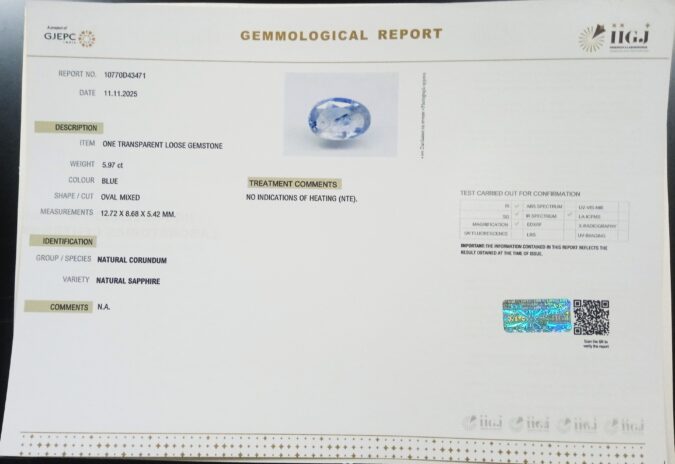 Beautiful 5.97 Cts Natural Blue Sapphire (AAA+-Mines) sva 6+ Ratti BLUE SAPPHIRE. Free Horoscope & Free Pundit Ji Astrological Advise / Consultation. Original Natural Lab certified gems by IGI GTL / Birth stones / Large Gem Selection of shree shubh Rashi Ratan Vedic dhan at Gem Mines. May Bhagwan Brahma, Vishnu, Shiv & Universe bless you.