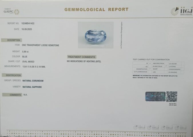 Beautiful 5.99 Cts Natural Blue Sapphire (Top-Mines) sva 6+ Ratti BLUE SAPPHIRE. Free Horoscope & Free Pundit Ji Astrological Advise / Consultation. Original Natural Lab certified gems by IGI GTL / Birth stones / Large Gem Selection of shree shubh Rashi Ratan Vedic dhan at Gem Mines. May Bhagwan Brahma, Vishnu, Shiv & Universe bless you.