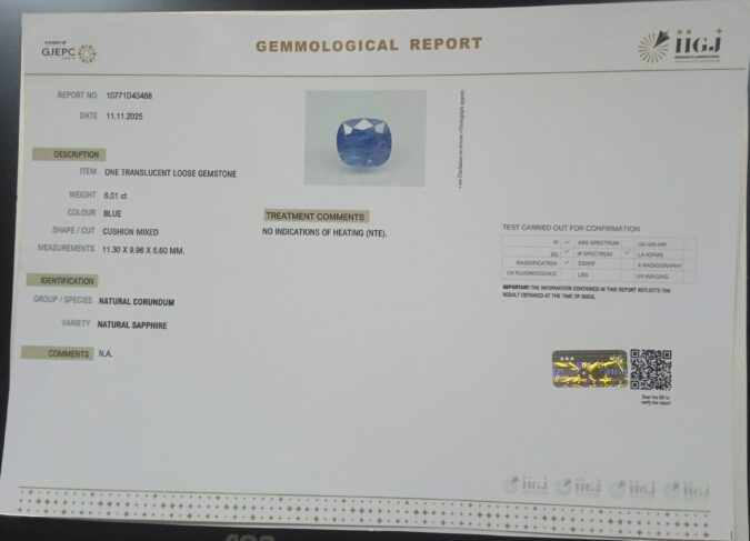 Beautiful 6.01 Cts NATURAL SAPPHIRE (AAA+-Mines) sva 6+ Ratti BLUE SAPPHIRE. Free Horoscope & Free Pundit Ji Astrological Advise / Consultation. Original Natural Lab certified gems by IGI GTL / Birth stones / Large Gem Selection of shree shubh Rashi Ratan Vedic dhan at Gem Mines. May Bhagwan Brahma, Vishnu, Shiv & Universe bless you.