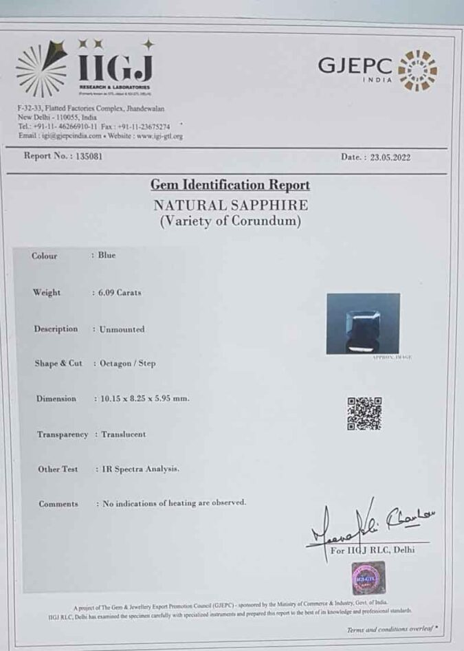 Beautiful 6.09 Ct. Blue Sapphire (Ceylon Mines) Sava 6 Ratti Neelam. Free Horoscope & Free Pundit Ji Advise / Consultation. Original Natural Lab certified gems by IGI GTL / Birth stones / Large Gem Selection of shree shubh Rashi Ratan Vedic dhan at Gem Mines. May Bhagwan Brahma, Vishnu, Shiv & Universe bless you.