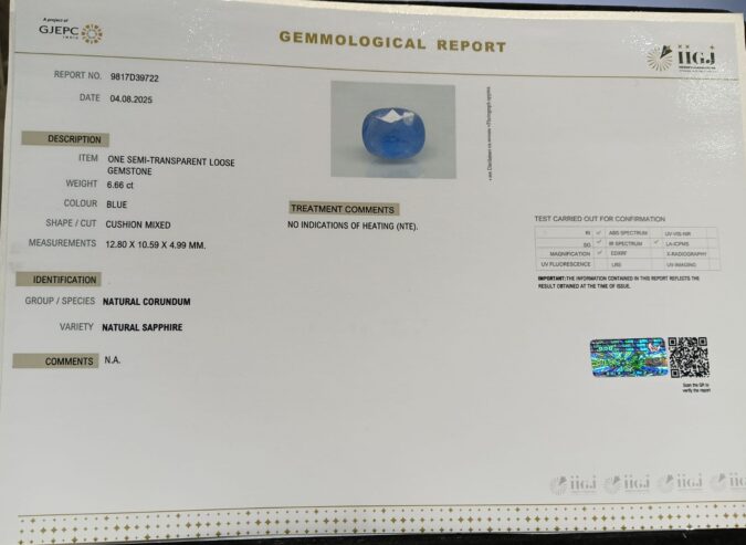 Beautiful 6.66 Cts Natural Blue Sapphire (Top-Mines) sva 7+ Ratti BLUE SAPPHIRE. Free Horoscope & Free Pundit Ji Astrological Advise / Consultation. Original Natural Lab certified gems by IGI GTL / Birth stones / Large Gem Selection of shree shubh Rashi Ratan Vedic dhan at Gem Mines. May Bhagwan Brahma, Vishnu, Shiv & Universe bless you.
