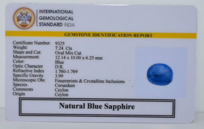 Beautiful 7.24 Cts Natural Blue Sapphire (AAA-Mines) sva 8+ Ratti BLUE SAPPHIRE. Free Horoscope & Free Pundit Ji Astrological Advise / Consultation. Original Natural Lab certified gems by IGI GTL / Birth stones / Large Gem Selection of shree shubh Rashi Ratan Vedic dhan at Gem Mines. May Bhagwan Brahma, Vishnu, Shiv & Universe bless you.