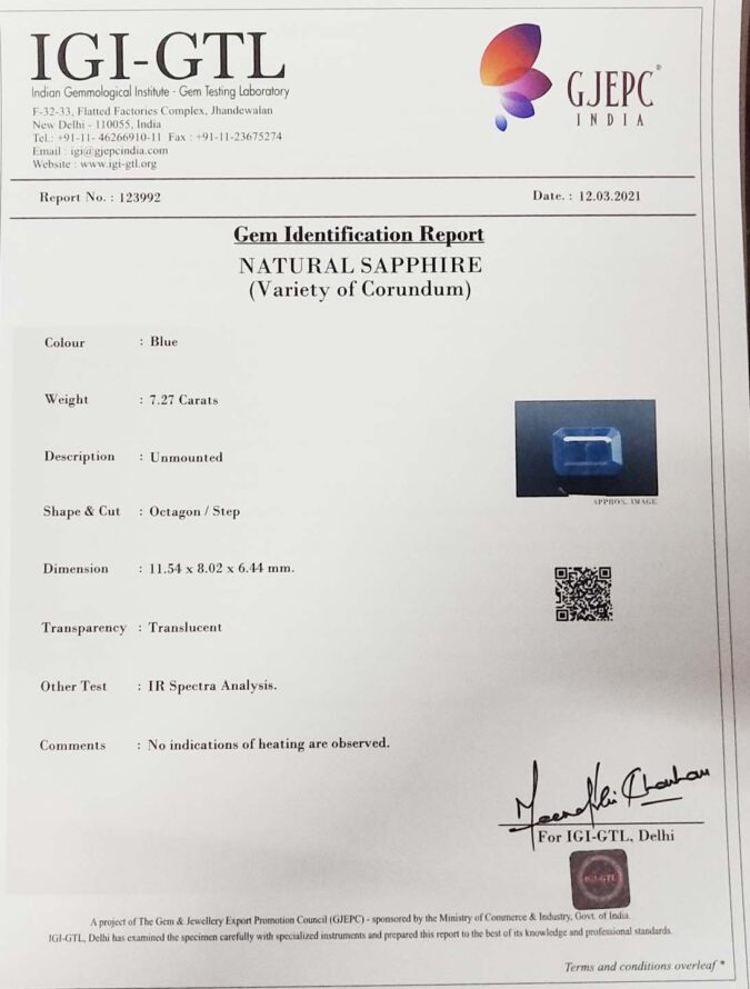 Beautiful 7.27 Ct. Blue Sapphire (Ceylon (Sri Lanka) Mines) Sava 8 Ratti Neelam. Free Horoscope & Free Pundit Ji Advise / Consultation. Original Natural Lab certified gems by IGI GTL / Birth stones / Large Gem Selection of shree shubh Rashi Ratan Vedic dhan at Gem Mines. May Bhagwan Brahma, Vishnu, Shiv & Universe bless you.