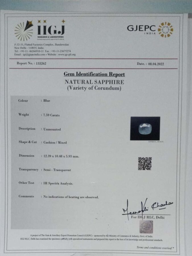 Beautiful 7.59 Ct. Blue Sapphire (Ceylon Mines) Sava 8 Ratti Neelam. Free Horoscope & Free Pundit Ji Advise / Consultation. Original Natural Lab certified gems by IGI GTL / Birth stones / Large Gem Selection of shree shubh Rashi Ratan Vedic dhan at Gem Mines. May Bhagwan Brahma, Vishnu, Shiv & Universe bless you.
