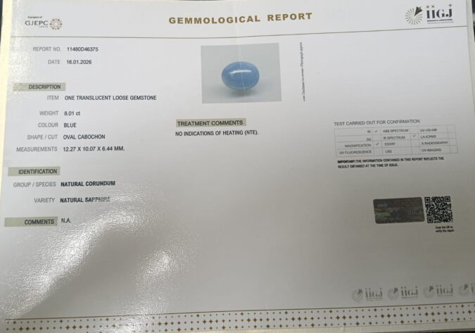 Beautiful 8.01 Cts Natural Blue Sapphire (AAA-Mines) sva 8+ Ratti BLUE SAPPHIRE. Free Horoscope & Free Pundit Ji Astrological Advise / Consultation. Original Natural Lab certified gems by IGI GTL / Birth stones / Large Gem Selection of shree shubh Rashi Ratan Vedic dhan at Gem Mines. May Bhagwan Brahma, Vishnu, Shiv & Universe bless you.