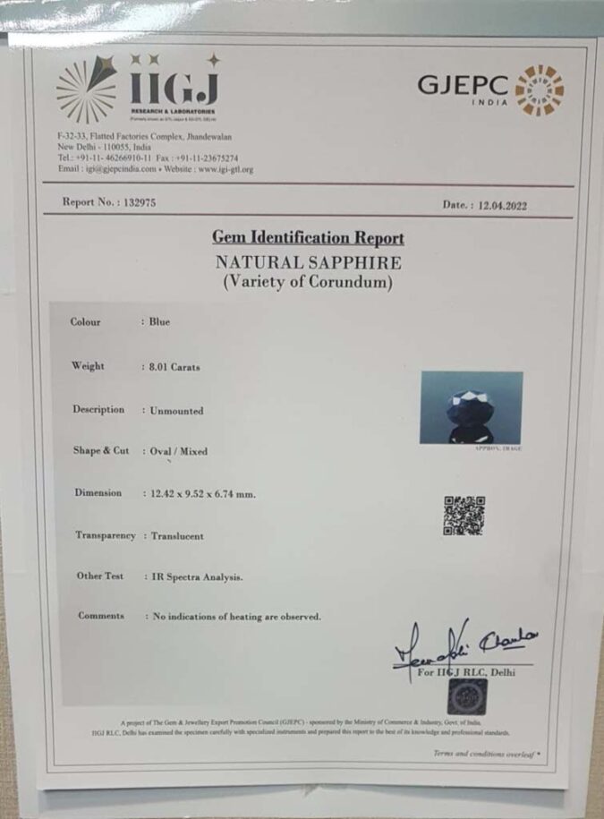 Beautiful 8.01 Ct. Blue Sapphire (Ceylon Mines) Sava 8 Ratti Neelam. Free Horoscope & Free Pundit Ji Advise / Consultation. Original Natural Lab certified gems by IGI GTL / Birth stones / Large Gem Selection of shree shubh Rashi Ratan Vedic dhan at Gem Mines. May Bhagwan Brahma, Vishnu, Shiv & Universe bless you.