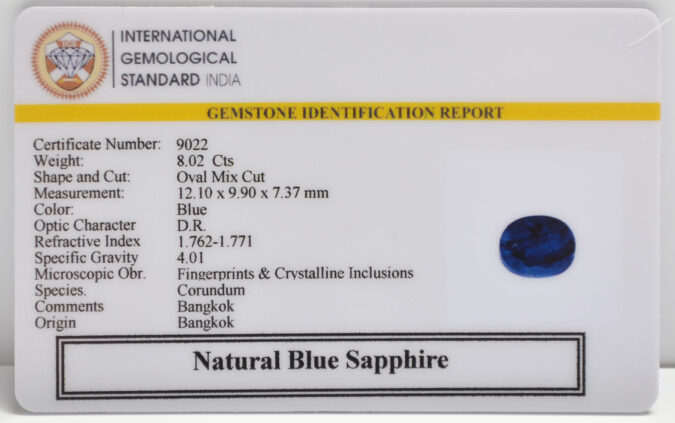 Beautiful 8.02 Cts Natural Blue Sapphire (Good-Mines) sva 8+ Ratti BLUE SAPPHIRE. Free Horoscope & Free Pundit Ji Astrological Advise / Consultation. Original Natural Lab certified gems by IGI GTL / Birth stones / Large Gem Selection of shree shubh Rashi Ratan Vedic dhan at Gem Mines. May Bhagwan Brahma, Vishnu, Shiv & Universe bless you.
