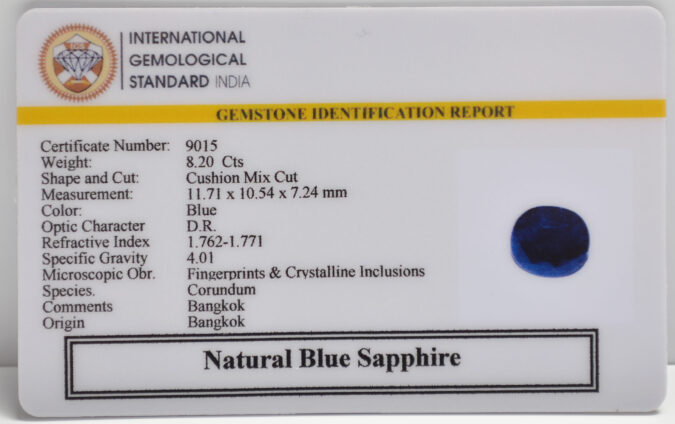 Beautiful 8.2 Cts Natural Blue Sapphire (Good-Mines) sva 9+ Ratti BLUE SAPPHIRE. Free Horoscope & Free Pundit Ji Astrological Advise / Consultation. Original Natural Lab certified gems by IGI GTL / Birth stones / Large Gem Selection of shree shubh Rashi Ratan Vedic dhan at Gem Mines. May Bhagwan Brahma, Vishnu, Shiv & Universe bless you.