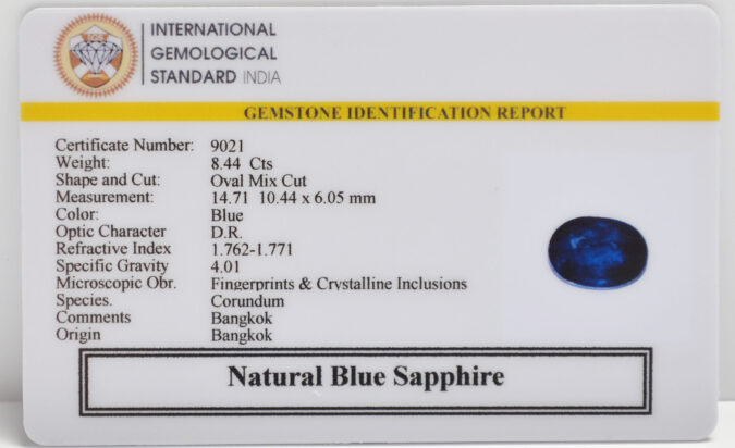 Beautiful 8.44 Cts Natural Blue Sapphire (Good-Mines) sva 9+ Ratti BLUE SAPPHIRE. Free Horoscope & Free Pundit Ji Astrological Advise / Consultation. Original Natural Lab certified gems by IGI GTL / Birth stones / Large Gem Selection of shree shubh Rashi Ratan Vedic dhan at Gem Mines. May Bhagwan Brahma, Vishnu, Shiv & Universe bless you.