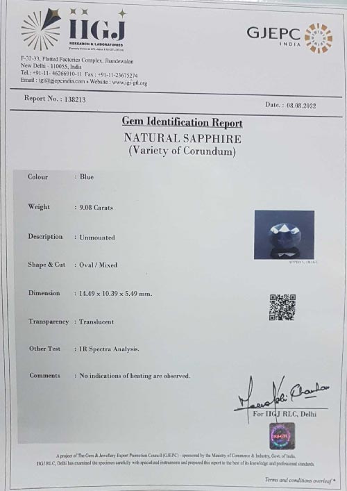 Beautiful 9.08 Ct. Blue Sapphire (Ceylon Mines) Sava 10 Ratti Neelam. Free Horoscope & Free Pundit Ji Advise / Consultation. Original Natural Lab certified gems by IGI GTL / Birth stones / Large Gem Selection of shree shubh Rashi Ratan Vedic dhan at Gem Mines. May Bhagwan Brahma, Vishnu, Shiv & Universe bless you.