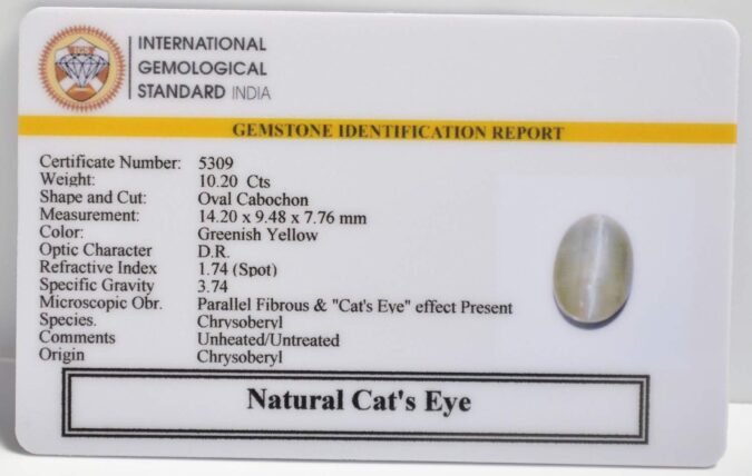 Beautiful 10.2 Cts Natural Cat’s Eye (AAA+-Mines) sva 11+ Ratti CATS EYE. Free Horoscope & Free Pundit Ji Astrological Advise / Consultation. Original Natural Lab certified gems by IGI GTL / Birth stones / Large Gem Selection of shree shubh Rashi Ratan Vedic dhan at Gem Mines. May Bhagwan Brahma, Vishnu, Shiv & Universe bless you.