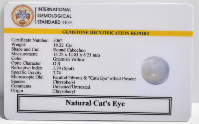 Beautiful 19.32 Cts Natural Cat’s Eye (AAA+-Mines) sva 21+ Ratti CATS EYE. Free Horoscope & Free Pundit Ji Astrological Advise / Consultation. Original Natural Lab certified gems by IGI GTL / Birth stones / Large Gem Selection of shree shubh Rashi Ratan Vedic dhan at Gem Mines. May Bhagwan Brahma, Vishnu, Shiv & Universe bless you.