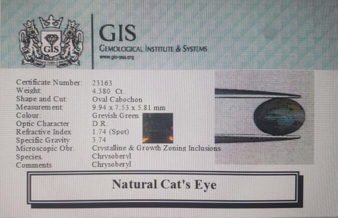 Beautiful 4.38 Ct. Cat’s Eye (Chrysoberyl Mines) Sava 4 Ratti Lehsunia. Free Horoscope & Free Pundit Ji Advise / Consultation. Original Natural Lab certified gems by IGI GTL / Birth stones / Large Gem Selection of shree shubh Rashi Ratan Vedic dhan at Gem Mines. May Bhagwan Brahma, Vishnu, Shiv & Universe bless you.