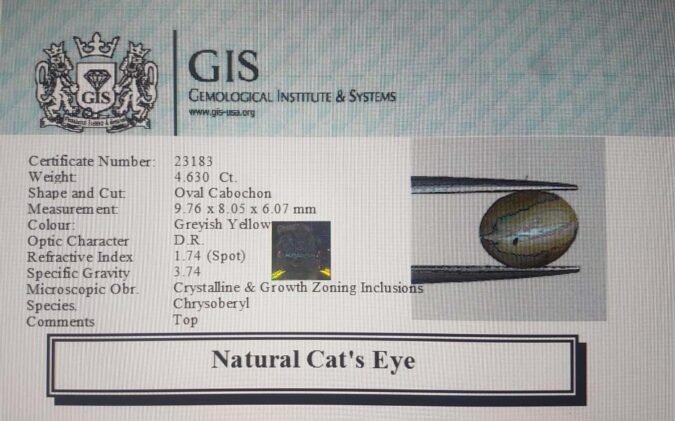 Beautiful 4.63 Ct. Cat’s Eye (Kanak Khet (Chrysoberyl) Mines) Sava 5 Ratti Lehsunia. Free Horoscope & Free Pundit Ji Advise / Consultation. Original Natural Lab certified gems by IGI GTL / Birth stones / Large Gem Selection of shree shubh Rashi Ratan Vedic dhan at Gem Mines. May Bhagwan Brahma, Vishnu, Shiv & Universe bless you.