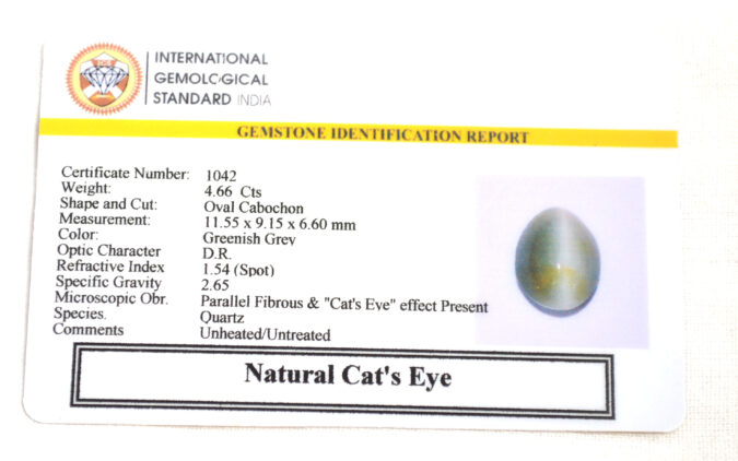 Beautiful 4.66 Cts Natural Cat’s Eye (AAA-Mines) sva 5 Ratti CATS EYE. Free Horoscope & Free Pundit Ji Astrological Advise / Consultation. Original Natural Lab certified gems by IGI GTL / Birth stones / Large Gem Selection of shree shubh Rashi Ratan Vedic dhan at Gem Mines. May Bhagwan Brahma, Vishnu, Shiv & Universe bless you.
