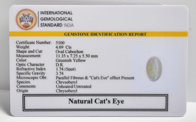 Beautiful 4.69 Cts Natural Cat’s Eye (AAA+-Mines) sva 5+ Ratti CATS EYE. Free Horoscope & Free Pundit Ji Astrological Advise / Consultation. Original Natural Lab certified gems by IGI GTL / Birth stones / Large Gem Selection of shree shubh Rashi Ratan Vedic dhan at Gem Mines. May Bhagwan Brahma, Vishnu, Shiv & Universe bless you.